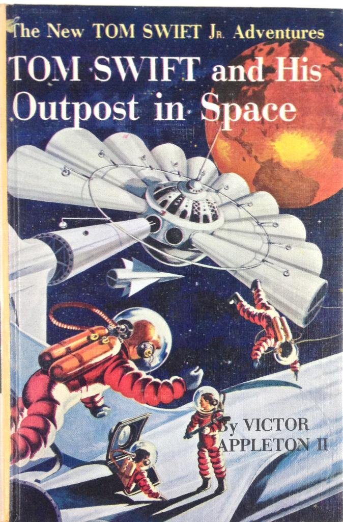 Extracted from the dustjacket of the A space station 22,300 miles above the earth is Tom Swift Jr.'s latest project! Tom's plans for his gigantic hub-and-spoke outpost of the universe calls for twelve laboratories. Solar batteries will be produced in one laboratory, another will be a celestial observatory, and another a radio broadcasting and TV station relaying programs over one third of the earth. But the project is beset from the start by a fiendish enemy, and also that weird phantom of outer space, Zero Gravity. Tom comes to grips with the problem of weightlessness by inventing a Zero chamber. Here, in order to master the helpless feeling encountered in space, men are trained to develop a new set of muscular reflexes. Crewmen crawling like flies up and down the walls and across the ceiling of Zero G creates momentary comic relief. But this is only a prelude to an exciting drama which takes place on a Pacific island, where Tom's rocket fleet is about to blast off. Strange warnings that terrify the natives nearly wreck Tom's plans. How the young scientist overcomes all obstacles and launches his space station makes a gripping book. And each technical detail of this fascinating story has been carefully checked. For those who enjoy the thrill of adventure and the chill of mystery, Outpost In Space is must reading