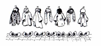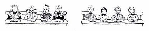 As a child, I would have pored over this picture, wanting to assign each character his or her correct name and imagining conversations between and among them. I was equally charmed by this depiction of the characters' coats and wooden shoes, carefully arranged inside their classroom: