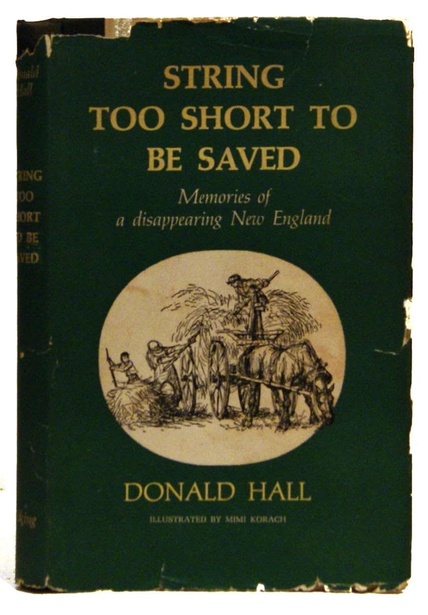 In the New Times a few years ago, I read a piece written by Donald Hall. He was in his 80s at that time, and he wrote about living in his grandparents’ old farmhouse in New Hampshire, alone after his wife had died. He wrote about loneliness and isolation. It was a beautiful, elegiac essay, and after seeing that this book String too Short to be Saved, was on James Mustich’s list, I was eager to read it.