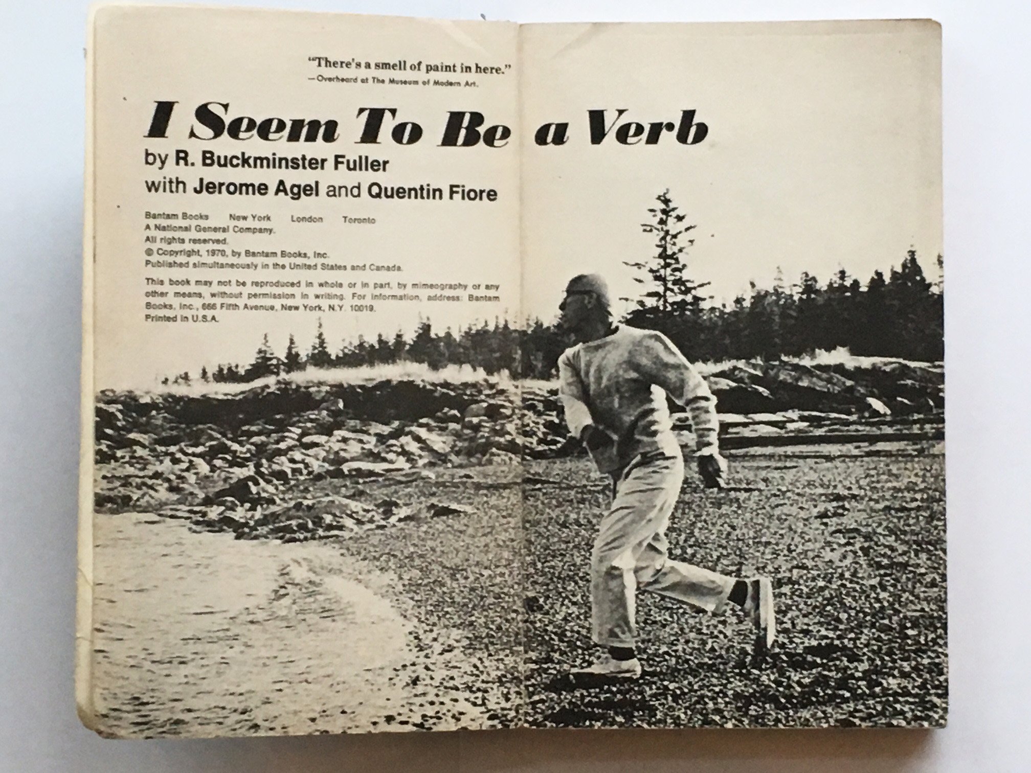 I Seem To Be A Verb is a title ripped from Buckminster Fuller’s most famous quote and important idea — that there are no nouns, no objects, only processes, verbs in universe. To convey that idea, this book was formatted as a dynamic collage. The pages consist of photos, illustrations, designs, and advertisements, overlayed and interspersed with blocks of text. The text consists of quotes and passages from Fuller, quotes from others, advertisements, and slogans. Once you’ve read it front to back, flip it over and read the green text (upside down as you first read through) back to front.