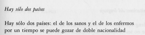 Hay sólo dos países: el de los sanos y el de los enfermos / por un tiempo se puede gozar de doble nacionalidad / pero, a la larga, eso no tiene sentido / Duele separarse, poco a poco, de los sanos a quienes / seguiremos unidos, hasta la muerte / separadamente unidos / Con los enfermos cabe una creciente complicidad / que en nada se parece a la amistad o el amor / (esas mitologías que dan sus últimos frutos a unos pasos del hacha) / Empezamos a enviar y recibir mensajes de nuestros verdaderos conciudadanos / una palabra de aliento / un folleto sobre el cáncer