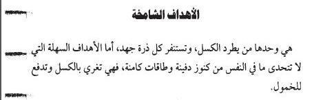 بعض ما أقتبس من الكتاب: 1. ارتد رداء الكسل صباحاً، وتلحف بغطاء الراحة مساء، وأبشر بخمول ذكرك، ودنو قدرك، وخسارة معركة العمر، من جراء كسلك!! 2. ما أشد كسله! من صمت عن رجاء رب وهاب ودعاء جامع مستجاب، فلم يقو على مجرد النطق بكلمات يسيرات. 3. "يا معاذ! والله إني لأحبك، أوصيك يا معاذ: لا تدعن في دبر كل صلاة أن تقول: اللهم أعني على ذكرك وشكرك وحسن عبادتك" 5. وتوازنك في أهدافك ضرورة، ونشاطك وهمتك لا بد لهما من أن يتوازعا على الواجبات المناطة بك، وإلا كان نجاحك في ميدان هو عنوان فشلك في ميادين أخرى، وقد تكون ميادين أهم وأخطر. 6. لا تصحب الكسلان في حالاته... كم صالح بفساد آخر يفسد عدوى البليد إلى الجليد سريعة.... كالجمر يوضع في الرماد فيخمد 7. لكن الفراق هنا ليس فراق الصحبة السوء نحو الفراغ، بل إلى صحبة اخرى لازمة، تغري بالخيرات، وتبث الشوق إلى الجنات. 8. فكلماتك تصنعك، وترسم مستقبلك، وحروفك إما أن تحرفك عن الطريق وإما أن تضعك على جادته.