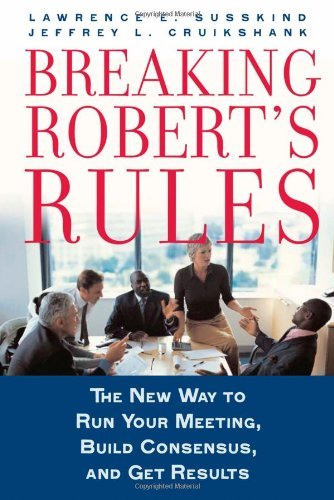 Robert's Rules probably helped large deliberative bodies make decisions together back in the 19th Century when they were developed, but they are highly inappropriate for a group of 8 volunteers working to plan a community event in 2012. So why does nearly every non-profit organization embed a reference to Robert's Rules in their bylaws? Habit. Not knowing how else to do it. Somebody in the group liked how another group's structure worked and they attribute it to Robert's Rules. The lawyer said we should. Whatever the reason... Professor Susskind has a better way. If you serve on any kind of board or committee, run to the nearest bookstore and pick this one up. Do not pass Go. Do not collect $200.