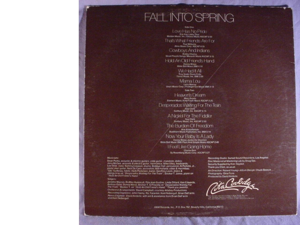 SIDE LOVE HAS NO PRIDE THATS WHAT FRIENDS ARE FOR COWBOYS AND INDIANS HOLD AN OLD FRIENDS HAND WE HAD IT ALL MAMA LOU SIDE HEAVENS DREAM DESPERADOS WAITING FOR THE TRAIN A NICKEL FOR THE FIDDLER THE BURDEN OF FREEDOM NOW YOUR BABY IS A LADY I FEEL LIKE GOING HOME