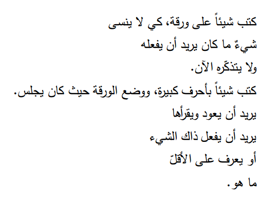 كتب شيئاً على ورقة، كي لا ينسى شيءٌ ما كان يريد أن يفعله ولا يتذكّره الآن. كتب شيئاً بأحرف كبيرة، ووضع الورقة حيث كان يجلس. يريد أن يعود ويقرأها يريد أن يفعل ذاك الشيء أو يعرف على الأقلّ ما هو. -----------