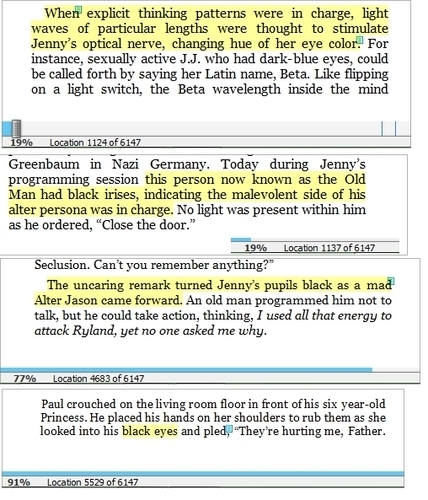 In this image, we see Byington attempting to explain how blue eyes can turn black when a new "alter" takes control, using the same kind of pseudo-scientific illogic found throughout the book, and examples where she claims this actually happened (all the people mentioned in these quotes are noted in the book as having light blue or green eyes):