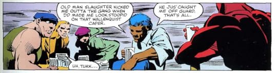 #170-172: the GANGWAR arc For his first attempt to write a long story (longer than one issue), Miller recycles a retired Spiderman foe, the Kingpin. Or maybe vice versa, in order to inject Kingpin into his own narrative, Miller needed a plot worth 60 pages of mob fights. Anyhow, from then on, Wilson Fisk (I think Miller gave Kingpin his actual name) will become Daredevil's nemesis. Matt Draper, a comics-focused YouTuber who likes to analyse every bit of Daredevil lore as if it was Dostoevsky, has this video on the story. So watch that if you want to hear about its themes: crime and redemption, salvation through love, perdition through loss. Whatever. Here what I liked the most. First, I don't know if it was already established by previous writers, but Miller's Daredevil is a funny superhero. His comedic times especially shine when he appears out of nowhere. I don't know, I just find hilarious when some bad guys are making conversation and he is already fucking there: Deedee's stealth mode eve defies the rules of optics: Poor Turks, he is the main victim of the sneaking Devil: And of course, the throwing panel: Issue #172 is famous for having all scenes introduced by vertical panels with views of the city and narration boxes. What I like, however, is the two page spread here below. Not only the lay-outs of the two pages are the same. The panel compositions are mirroring each other, with Kingping and Bullseye in similar positions, and the line of Fisk's smoke repeated as the trajectory of a buzzing fly in the following page.