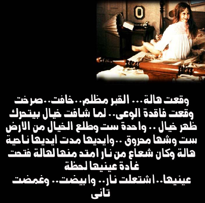 وقعت هالة .. القبر مظلم .. خافت .. صرخت" وقعت فاقدة الوعى .. لما شافت خيال بيتحرك ظهر خيال .. واحدة ست وطلع الخيال من الأرض ست وشها محروق .. وإيديها مدت إيديها ناحية هالة وكان شعاع من النار إمتد منها لهالة فتحت هالة عينيها لحظة "عينيها..اشتعلت نار..وابيضت..وغمضت تانى