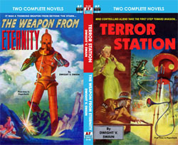 The Weapon From Eternity: Free-world raiders strike against the tyrannical Federation; good old fashioned space opera, just turn off your brain and run with the excitement. The reckless plot covers attempted kidnappings, captures, crosses and double crosses in the blink of an eye. Lots of action, lots of twists; just another '50s space opera, but this one's fun and full of surprises. I really enjoyed it; a little cheesy, but very entertaining.