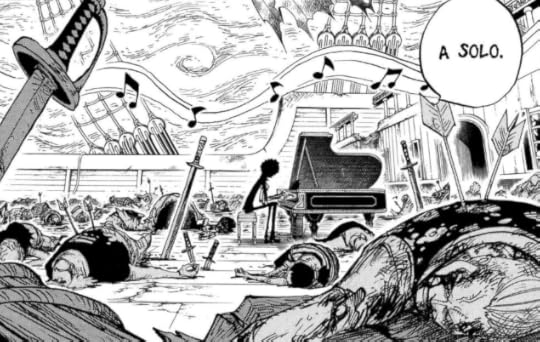 Brook makes for an unusual Straw Hat: he doesn't have a tragically dead mentor or friend in his backstory - there's his whole crew, but in a way they're all still alive in his dial - and it all comes across as strangely hopeful and going forward in comparison to what the others all went through. His dream is not nearly as nebulous or difficult or far-reaching as the dreams of the others: he knows exactly what he has to do and how to do it. All he needs to do is to make a return.