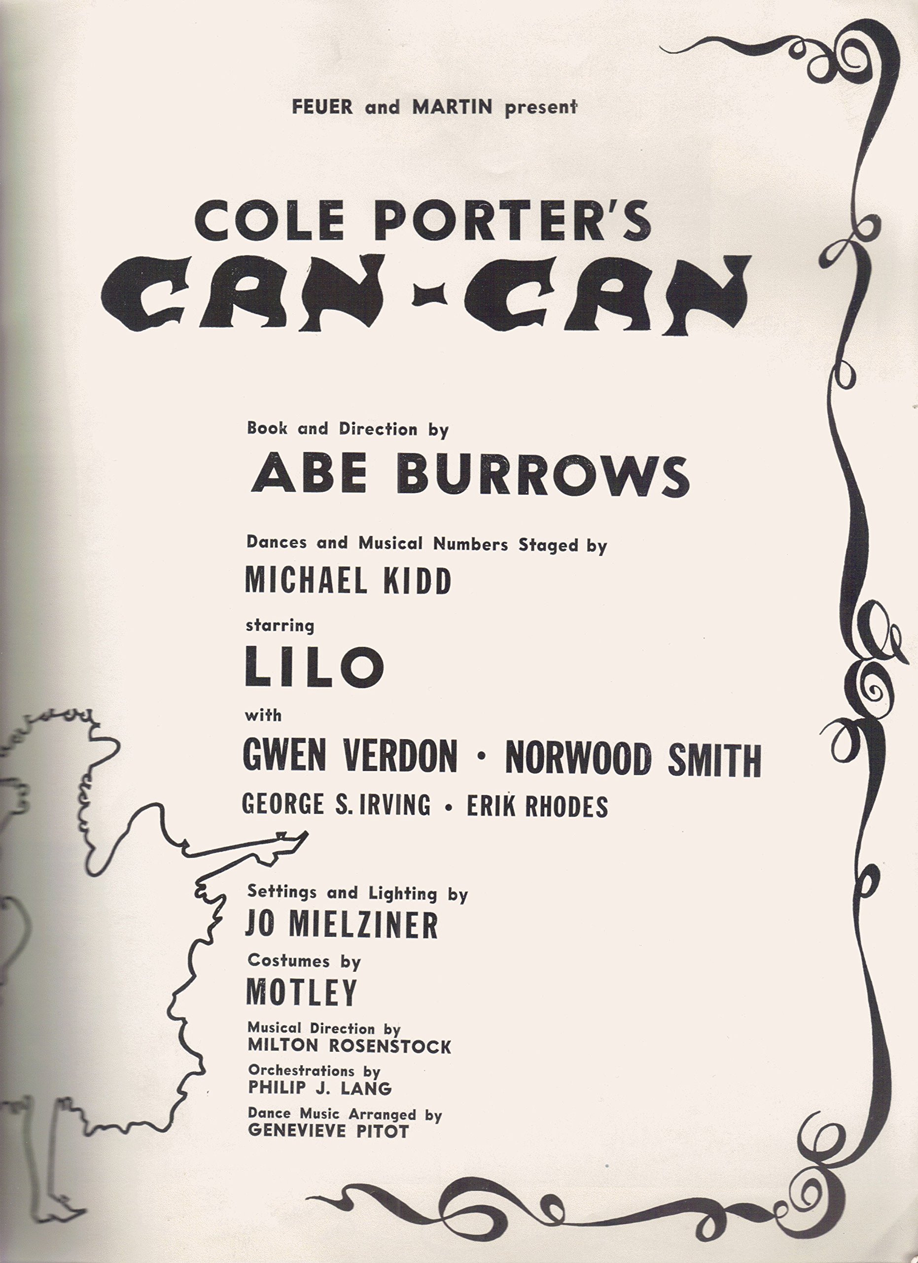 After the pre-Broadway tryout at the Shubert Theatre in Philadelphia in March 1953, Can-Can premiered on Broadway on at the Shubert Theatre on May 7, 1953, and closed on June 25, 1955 after 892 performances. The original production, which Burrows also directed, starred Lilo starred as La Mome, Hans Conried as Boris, Peter Cookson as the judge, Gwen Verdon as Claudine, Dania Krupska, Phil Leeds, Dee Dee Wood, and Erik Rhodes as Hilaire. Michael Kidd was the choreographer. According to Ben Brantley, Claudine was "the part that made Gwen Verdon a star. The cast was changed in 1954. Program is 16 pages. B/W photos throughout.