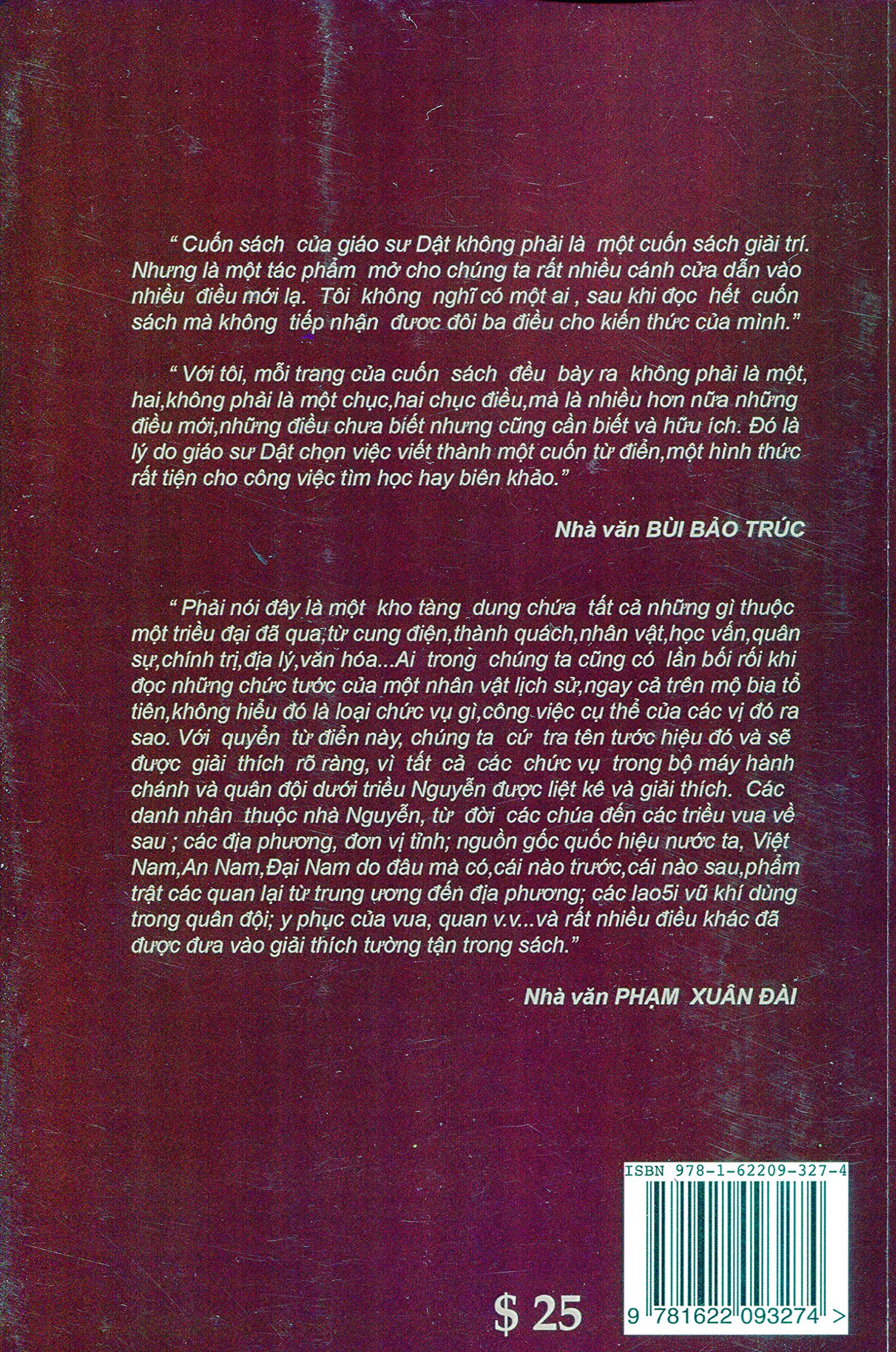 Cuốn Từ Điển Nhà Nguyễn là một kho tàng dung chứa tất cả những gì thuộc một triều đại đã qua, từ cung điện, thành quách, nhân vật, học vấn, quân sự, chính trị, địa lý, văn hóa... Ai trong chúng ta cũng có lần bối rối khi đọc những chức tước của một nhân vật lịch sử, ngay cả trên mộ bia tổ tiên, không hiểu đó là loại chức vụ gì, công việc cụ thể của các vị đó ra sao. Với quyển từ điển này, chúng ta cứ tra tên tước hiệu đó và sẽ được giải thích rõ ràng, vì tất cả các chức vụ trong bộ máy hành chánh và quân đội dưới triều Nguyễn được liệt kê và giải thích. Các danh nhân thuộc nhà Nguyễn, từ đời các chúa đến các triều vua về sau; các địa phương đơn vị tỉnh; nguồn gốc quốc hiệu nước ta Việt Nam, An Nam, Đại Nam do đâu mà có, cái nào trước cái nào sau; phẩm trật các quan lại từ trung ương đến địa phương; các loại vũ khí dùng trong quân đội; y phục của vua, quan v.v... và rất rất nhiều điều khác đã được đưa vào giải thích tường tận trong sách.