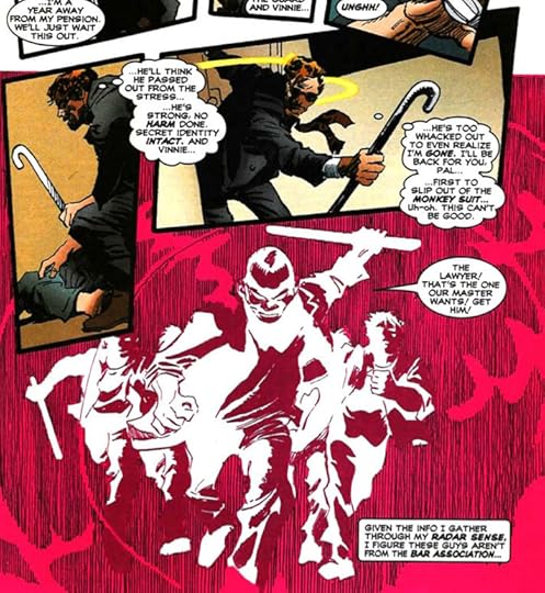 Eu acabo de adquirir um novo respeito pelo leitor de quadrinhos que, nos anos 90, todo mês comprava gibizinho do Demolidor, porque é muito ruim. Sério. É inexplicável. Primeiro tivemos o Demolidor de armadura, depois tentativas frustrantes de corrigir aquela porcaria, e agora, bom, agora foi o boi e as cordas com o Joe Kelly. É. O cara do Deadpool. A primeira coisa que ele faz? Deadpool, Demolidor e Mary Tifóide num retcon horrível do Homem Sem Medo do Miller/Romitinha. Depois, ainda temos o Sr Medo num plano mirabolante para fazer o Homem Sem Medo sentir, bom, medo, obviamente , que envolve acusar a Karen Page de assassinar um policial - e ela matou o cara mesmo. Também temos atribulações amorosas no namorico do Foggy com a Liz Osborn, a mãe e a meia-irmã do Foggy também aparecem por aí. Depois de tudo isso, para colocar sal grosso na ferida, Scott Lobdell aparece, faz uma lavagem cerebral no Demolidor e manda ele pra Paris. A troco de quê? Não sei, o agente da Shield que cuidava disso morreu atropelado. Sério. E para esfregar o sal grosso, a última edição - 380 - tem o Chichester escrevendo uma metaficção sobre o Deathdevil - um Demolidor de Armadura, claro, que solta bombas nucleares pelos punhos. Eu deveria ter gastos meu Vintão em Ploc Gigante Laranja/Uva que eu teria ficado mais feliz.