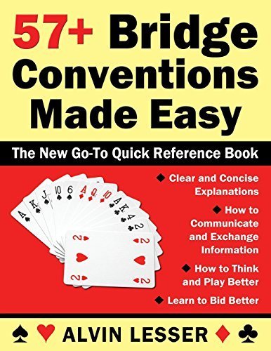 57+ Bridge Conventions Made Easy clearly and concisely describes and explains conventions for all bridge players to maximize their bidding, enabling both partners to have an exact understanding of each other's bids. With over 200 charts and tables, and many examples, novice and intermediate bridge players can easily learn how to communicate the most popular bridge conventions. Advanced players are also able to learn new and unfamiliar conventions. This book is easy to read as it has no extraneous details. It is written clearly and concisely so that each member of the partnership will have an exact understanding of their partner's bid. This book is loaded with information about how to use - and avoid abusing - a long list of conventions. 57+ Bridge Conventions Made Easy can be used by steady partners and by casual partners. The book is arranged alphabetically and indexed so that a convention can be easily found. Awarded the 2016 eLit Gold Award for Best How-To Book and the Bronze Award for Education/Academic/Teaching . The Revised 2nd Edition was edited by Brent Manley. four-color, 8.5 x 11 (216 mm x 280 mm), 172 pages. Conventions #1 Balancing #2 Bergen Responses #3 Blackwood #4 Brozel #5 Cappelletti #6 Checkback Stayman #7 Cuebids #8 DOPI, ROPI, DEPO & REPO #9 DONT #10 Drury #11 Flannery #12 Forcing #13 Fourth-Suit Forcing #14 Gambling 3NT #15 Gerber (4 Clubs) #16 Grand Slam Force #17 Inverted Minor Raises #18 Jacoby Transfers #19 Jacoby 4-Suit Transfers #20 Jacoby 2NT #21 Jordan 2NT #22 Journalist Leads #23 Landy #24 Lavinthal Discards #25 Law of Total Tricks #26 Lebensohl 2NT Over Opponent's Weak Two-Bid #27 Losing Trick Count #28 Maximal Double #29 Michaels Cue Bid #30 Mini Roman #31 Minor-Suit Stayman #32 Namyats #33 Negative Double #34 New-Minor Forcing #35 Odd-Even Discards #36 Ogust #37 Overcalls #38 Preemptive Bids #39 Puppet Stayman #40 Responsive Double #41 Rules in Bridge #42 Rusinow Leads #43 Smolen Transfer #44 Splinter Bid #45 Stayman #46 Step Responses to a Strong Two Club Opening #47 Strong 1 Club (Precision) #48 Support Doubles #49 Takeout Double #50 Texas Transfers #51 Strong 2 Clubs #52 Two Over One Game Force #53 Upside-Down Count and Attitude #54 Unusual 2NT #55 Weak Jump Shift #56 Weak 1NT #57 Weak Two-Bids #58 Western Cue Bid