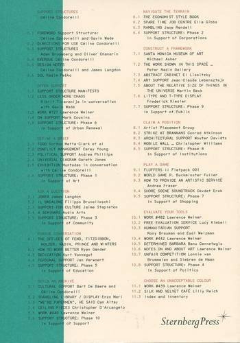 Support Structures is a manual for what bears, sustains, and props, for those things that encourage, care for, and assist; for that which advocates, articulates; for what stands behind, frames, and it is a manual for those things that give support. While the work of supporting might traditionally appear as subsequent, unessential, and lacking value in itself, this manual is an attempt to restore attention to one of the neglected, yet crucial modes through which we apprehend and shape the world. Support Structures is a critical enquiry into what constitutes “support,” and documents the collaborative project “Support Structure” by Céline Condorelli and Gavin Wade. While registering and collecting reference projects in a new archive of support structures alongside its ten-phase project, different writers, thinkers, and practitioners were invited from various fields to elaborate on frameworks and work on texts, which form the theoretical backbone of the publication. The collection of contributions offers different possibilities for engaging in this unchartered territory, from propositions to projects, existing systems to ones invented for specific creative processes. Support Structures offers support through potential methodologies, inspirations and activations for practice, and addresses important questions for art and architecture practices on forms of display, organization, articulation, appropriation, autonomy, and temporariness, and the manifestations of blindness towards them. Produced in co-production with Support Celine Condorelli and Gavin Wade with James Langdonwww.supportstructures.org ContributorsMichael Asher, Artist Placement Group, Can Altay, Conrad Atkinson, Adam Broomberg & Oliver Chanarin, Lonnie van Brummelen & Siebren de Haan, Banu Cennetoglu, Christopher D'Arcangelo, Martin Beck, Cevdet Erek, Andrea Fraser, Buckminster Fuller, Ryan Gander, Ella Gibbs, Frederick Kiesler, Lucy Kimbell, James Langdon, El Lissitzky, Peter Nadin, “The offices of Peter Fend, Coleen Fitzgibbon, Jenny Holzer, Peter Nadin, Richard Prince & Robin Winters,” Gordon Matta-Clark, Antoni Muntadas, Lilly Reich, Support Structure, Rirkrit Tiravanija, Lawrence Weiner, Christopher Williams, Carey Young, a.o.