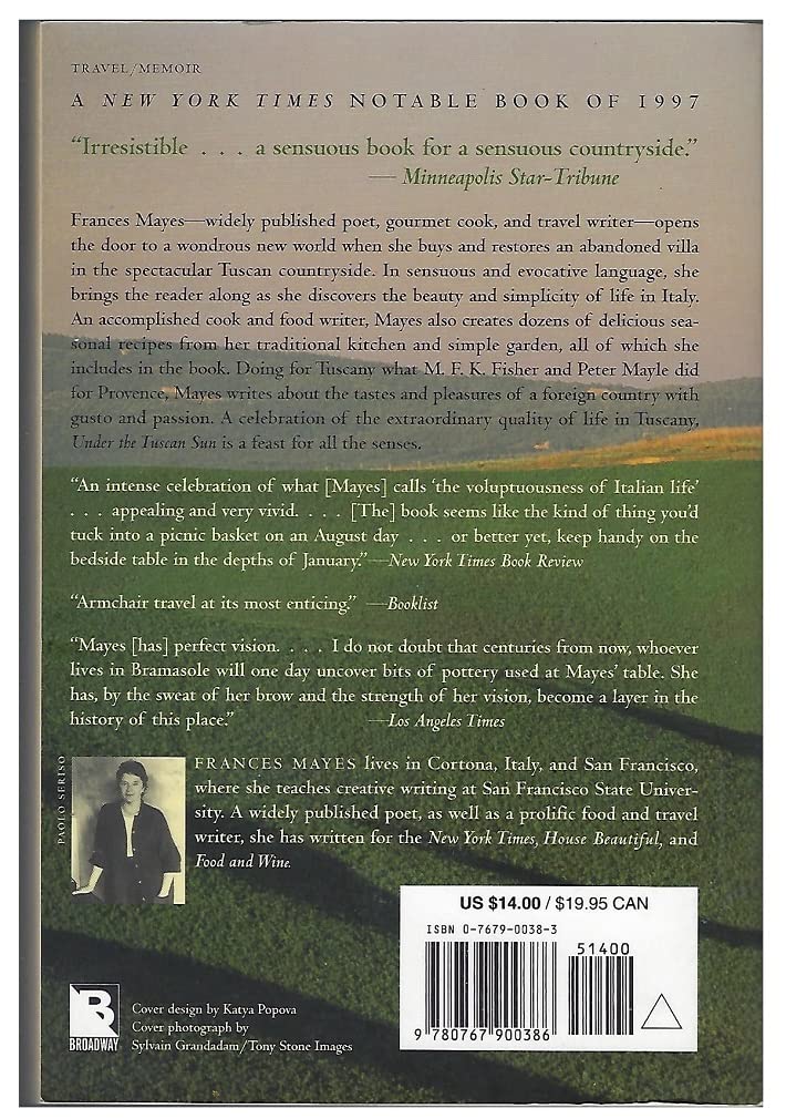 Plot: Author summers in Tuscany, buys an old farmhouse, refurbishes it, travels through Italy, and cooks constantly.