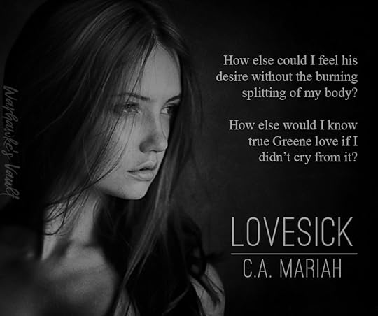 I've never read C. A. Mariah's books, but she takes you on one hell of a ride. I was excited when this showed up on my Kindle! This is not for the faint of heart, so if you enjoy sick, twisted, demented, and pitch black fucked up books, then this just might be up your alley. I was consumed by Lovesick and couldn't put it down. I needed to know what happened next.