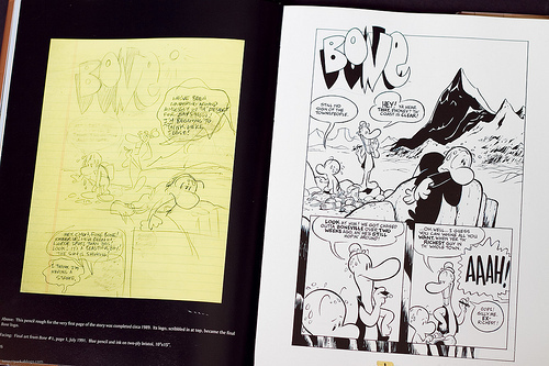 This is a huge 200-page hardcover collecting the artworks that went behind creating Bone. You can even see comics strips - the origin of Bone - drawn by Jeff Smith when he was 9 years old. There are also sketches, rough layouts, inking boards with all the corrections pasted over corrections, photo reference used for the backgrounds, selected black and white as well as coloured panels and covers. All are captioned and most come with a short commentary.