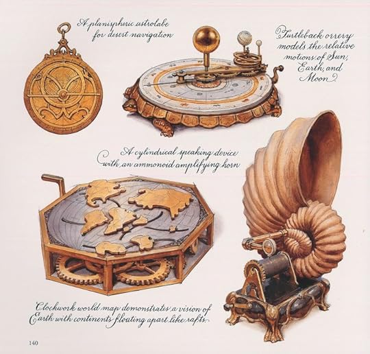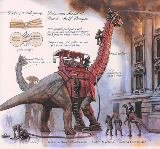 As always, Gurney's artwork in breathtaking, whether photorealistic, impressionistic or merely whimsical. And his imagination runs wild here, both in placing his humans and dinosaurs in practical situations or in inventing the technology, cultures and trinkets of his lost world, (see the brachiosaurus firetruck and mechanical gadgets below; he also includes other illustrations that finally allowed me to understand both the Fibonacci sequence and how windmills work!). I'm also throwing in a few additional pictures just to give you a taste of what the book offers; with the updated release available on Amazon for just $23, I hope this encourages some of y'all to get a copy of your own — you might even still be able to get it in time for Christmas!