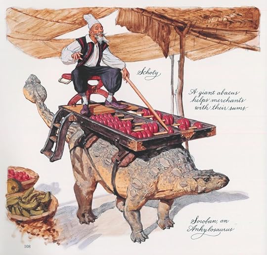 Because Gurney left out the ancient, advanced technology, and because Arthur is our narrator again, we finally get back to the amazing world-building of the first book. We've got street vendors who use the spikes on a dinosaur to hold fresh bread loaves that look like giant donuts. We've got skybax jousting. We've got a giant abacus strapped to the back of a dinosaur and an old man on top, creating an accounting partnership for the marketplace. We've got intricate drawings of the workings of a windmill. We've got songs written out in musical notation. We've got variations of the dinosaur alphabet. We've got Brachiosaurus fire-trucks, with details about how the pump works and what everything does. We've got two different schools of philosophy; one that wears spots and preaches a form of empiricism, one that wears lines and preaches a form of solipsism. We've got a village of people who shipwrecked, got their boats back with the help of the dinosaurs, cut them in half to form their homes, and believe that if Earth itself should ever "capsize" their ships will become whole again and sail them into the stars and keep them safe (unique religions! Yay!)