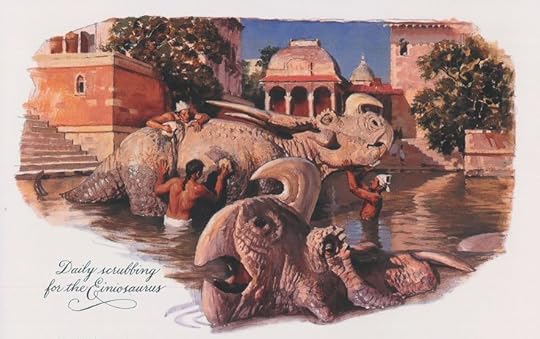 That said, Gurney uses this book as a nice way to catch up with the current science, introducing feathered dinosaurs to his previously all-reptilian world, (and I still find it unbelievable to think that the whole idea of "dinosaurs had feathers" is less than 25 years old — i.e., since his previous books came out). And he gets to expand on his original world-building in new and interesting ways — Chandara is a very Asian/Middle Eastern-themed "empire." His artwork also remains as impressive as ever, and in his more architectural paintings almost approaches a Simon Stålenhag feel, (whose Tales from the Loop books also put "look" way ahead of "story"):