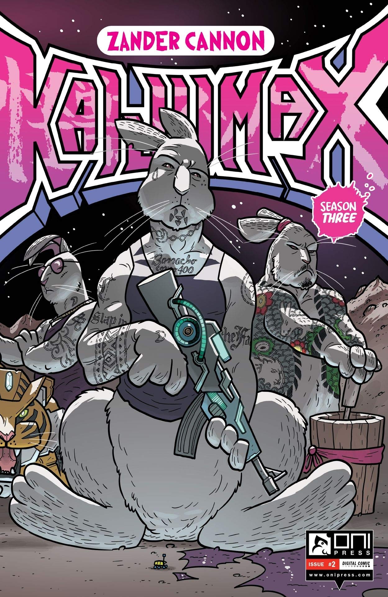 KAIJUMAX's last good drug connect has been gone for a while, and the kaiju inmates are fiending for uranium; enter Zonn, Terror of Nagoya and the doctor he's got in his... er, pocket to bring the good stuff from a new operation on the moon. Meanwhile, Whoofy, the young mob boss picking up the pieces after his father's death starts to learn what tough rules must be followed -- and whose appendages must be broken -- to stay in power on the inside. Bullying flashbacks! Terrifying moon bunnies! And... astro-kiestering?