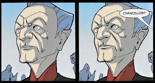 I didn't love the art style in this book, and particularly the coloring work. It was a bit bland and minimalist, but it gets the job done and conveys a lot with a little. The characters' faces are very expressive, which is great, for example, for the moment when Palpatine learns for the first time that Maul is still alive. The vignettes where we see Maul's escape from Naboo are particularly good.