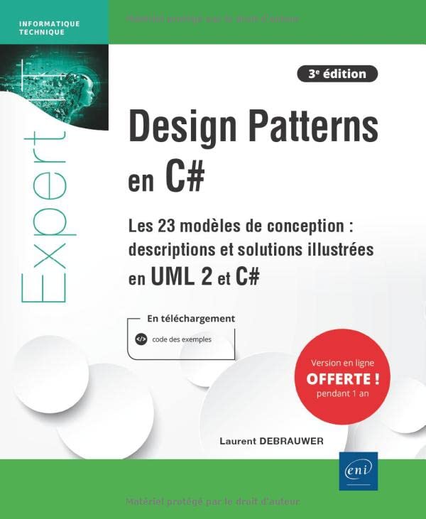 Design Patterns en C# . Les 23 modèles de conception : descriptions et solutions illustrées en UML 2 et C# . Ce livre présente de façon concise et pratique les 23 modèles de conception (Design Patterns) fondamentaux en les illustrant par des exemples pertinents et rapides à appréhender. Chaque exemple est décrit en UML et en C# sous la forme d'un petit programme complet et exécutable. Pour chaque pattern, l'auteur détaille son nom, le problème correspondant, la solution proposée, ses domaines d'application et sa structure générique. . Le livre s'adresse aux concepteurs et développeurs en Programmation Orientée Objet . Pour bien l'appréhender, il est préférable de disposer de connaissances sur les principaux éléments des diagrammes de classes UML et sur le langage C# (à partir de la version 3.0).. Le livre est organisé en trois parties qui correspondent aux trois familles des patterns de conception : les patterns de construction , les patterns de structuration et les patterns de comportement. . Un chapitre présente trois variantes de patterns existants, montrant la grande souplesse de mise en oeuvre de ces modèles.. Cette nouvelle édition du livre introduit une présentation du pattern MVC (Model-View-Controller) illustré par un exemple s'appuyant sur le framework Blazor. Laurent Debrauwer est docteur en informatique de l'Université de Lille 1. Spécialiste de l'approche par objets, il enseigne les Design Patterns à l'université du Luxembourg. Il dirige également la société Securiquest spécialisée dans la sécurité informatique et la formation UML..