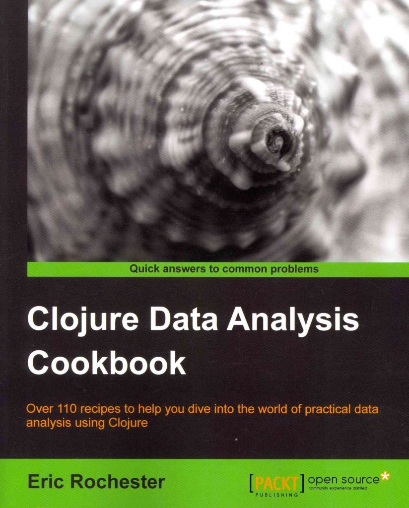 This book is a good tutorial on data science using Clojure. It starts with working with data (access and cleaning up), then the various chapters cover a range of tasks from focusing on numeric computing (performance, parallel processing), statistics (Incanter and other numerical libraries), working with other numerical software (Mathematica and R), graphics, and the web. The topics are actually a fairly complete look at data science, so it feels more like a tutorial than a cookbook.