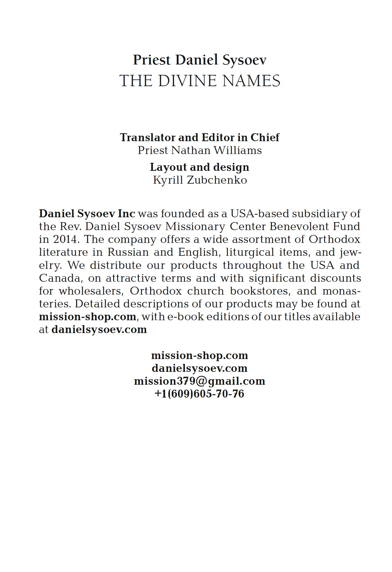 The essence of God is fully known to three the Father, the Son, and the Holy Spirit. All others know only what God reveals to them about Himself, diminishing His power, as it were, in order to become accessible to us. We address Him by the names “He That Is,” “Ancient of Days,” “Life,” “Most Wise,” “Good,” and others, each of which emphasizes a particular facet of divine perfection. Through learning the names of the Most High, Whose existence is beyond comparison with anything in the universe, a person enters the crucible of meaning, and his understanding is enabled to enrich the whole world by supernatural revelations. Booklet 2 of 12 from a series of talks given by Priest Daniel Sysoev entitled “How to Inherit Eternal Life.” 48 pp. Priest Daniel Sysoev. The Divine Names. Daniel Sysoev Inc, New Jersey, 2018. 978-5-4279-0074-7