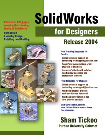 SolidWorks for Designers Release 2004 is a textbook written with the tutorial point of view with learn-by-doing as the theme. About 35 mechanical engineering industry examples are used as tutorials in this book and an additional 25 as exercises to ensure that the user can relate his knowledge of this book with the actual mechanical industry designs. This textbook consists of 13 logically sequenced chapters covering the Part, Assembly, and Drawing modes of SolidWorks 2004. Every chapter begins with a command section that provides detailed explanation of the commands and tools in SolidWorks 2004. The command section is followed by tutorials that are created using these commands. This approach allows the user to use this textbook initially as a learning tool and then later use it as a reference material. Special graphics are provided on the commands or tools that are new in SolidWorks 2004 or are enhanced in this release. This allows the reader to recognize all the new additions and enhancements in SolidWorks 2004. The author provides free technical support to all the users of this textbook. The users can contact techsupport@cadcim.com for any technical query they have. The author provides the following teachings aids free to faculty using this textbook. · PowerPoint Presentations for every chapter in this textbook. You can easily customize these PowerPoint Presentations based on the requirements of the course you are teaching. · Instructor’s guide with solutions to all review questions and steps to complete all the exercises. · Part, Assembly, and Drawing files of all tutorials and exercises used in this textbook. · Course outline. The course outline clearly indicates which sections are to be taught in the introduction or basic class and which sections are for advanced class. This allows you to easily select the topics to be taught in your course. · Student projects. · Class tests that you can use as the "end of the course" tests. Please contact the author at stickoo@calumet.purdue.edu or tickoo@cadcim.com to access all these teaching aids.