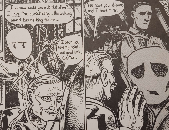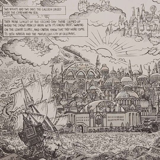 "Carter había decidido llegar con audaz empeño hasta donde ningún otro ser humano había llegado antes, y desafiar los glaciales desiertos atravesando la oscuridad hasta donde la ignota Kadath, cubierta de nubes y coronada de estrellas inimaginables, mantiene escondido y en la perenne nocturnidad el castillo de ónice de los Grandes"
