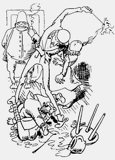 The story includes 48 drawings by the author like the one above each accompanied by two lines of rhymed text. As usual with Busch we find some onomatopoeia, for example Schnapp, Patsch, Perdums (I never heard the last one before). Like in modern comic strips the fur does fly here. Even blood splashes at some time, but only a little in the form of black dots like here from the aunt’s nose: