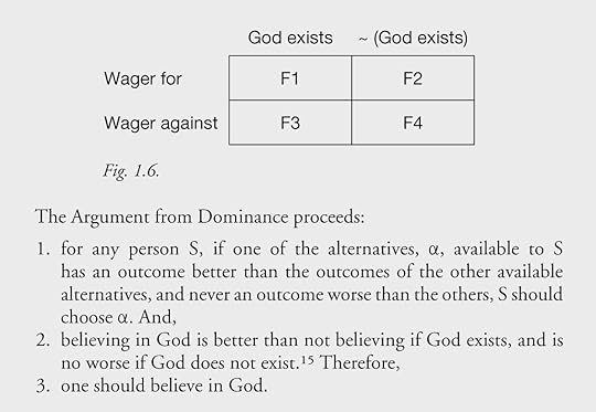الكتاب يحتوي على معادلات رياضية بسيطة تشتمل على الجمع والقسمة والضربة والاحتمالات، ومعادلات منطقية صعبة تتطلب أن تحفظ العديد من الفرضيات الموجودة ضمن صفحات عديدة تتعبك أثناء محاولة الرجوع إليها ثم تحول كل فرضية إلى رمز، والثانية غضضت الطرف عنها لأنها تحتاج إلى المذاكرة ولم يكن غرضي هذا باعتبار أننا والحمدلله نستدل على وجود الله تعالى بالعقل وبادلة واضحة وصريحة، أما الأولى فهي تطبيق لما يسمى بنظرية القرار Decision Theory وهي نظرية تستعمل في الإدارة وتقييم المخاطر، وتستعمل من قبل الأشخاص العاديين من غير أن يشعروا، وهي جذابة ويمكن أن تساعدني مستقبلًا لاهتمامي برد الشبهات، لأنها أكثر قبولا عند الناس باعتبار أنها تتستعمل الاعداد كما يمكن تحويلها لفرضيات منطقية بسيطة.