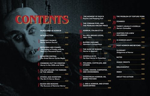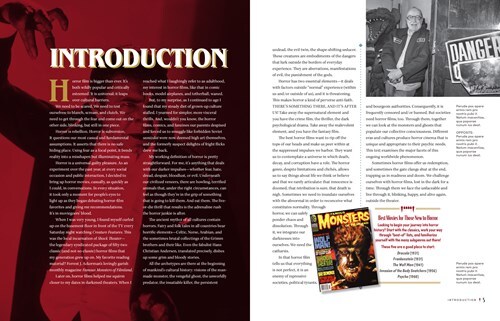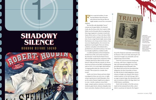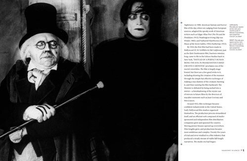 The Chapter One opening spread, and first text spread, gives us the basic format's development into the informative delivery medium for the deep-enough dive into the development and trends in horror film from the initial efforts through our present era of splatters in place of scares. Gross oversimplification on my part, and not universally true; like all generalizations, exceptions abound. Go look into Bollywood horror...go learn about the reason we've seen such an explosion of horror franchises...find out who directed a horror film that you'd swear an oath would never have done such a thing.