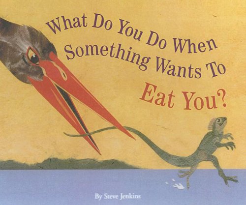 In What Do You Do When Something Wants to Eat You, Steve Jenkins reveals the hidden defense mechanisms of some of nature’s most intriguing and resourceful creatures. As Jenkins asserts, “Most animals face the constant danger of being eaten by other animals. This book shows a few of the ways that they try to avoid this fate.” Each page shows an animal being tracked by a predator. Animals are identified in sentences that end in ellipses, leaving the reader hanging until the page is turned. After flipping the page, readers will see the animals’ built-in defense systems in action. An octopus is shown squirting a cloud of ink to make its escape, a basilisk lizard can walk over water to avoid ending up in the stomach of its enemy, and a glass snake can detach its tail and slither away when it is trod upon by a foe.
