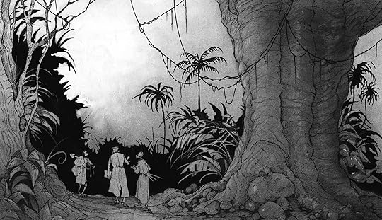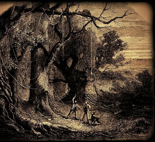 هذا الرسم يصور لحضة البحث عن الكنز تحت الشجرة العملاقة، التي اُشير فيها في شيفرة الرق..