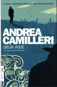 Oblik vode prvi je Camillerijev roman o diljem svijeta popularnom policijskom komesaru Salvu Montalbanu. Od 1994. godine, kada ga je objavila izdavačka kuća Sellerio iz Palerma, pa do danas roman je u Italiji doživio niz izdanja, a preveden je na više od dvadeset jezika, prvi put u Francuskoj 1998., gdje je godinu dana poslije nagrađen nagradom Prix Mystère de la Critique za najbolji strani roman. U ozloglašenoj zoni na periferiji malog sicilijanskog primorskog mjesta smetlari Pino Catalano i Saro Montaperto pronalaze truplo ugledna inženjera i političara Silvija Luparella. Istodobno, u blizini, jedan od njih pronalazi izgubljenu skupocjenu ogrlicu... U istragu se uključuje policijski komesar Salvo Montalbano, pa time počinje uzbudljiv zaplet koji vrtložno usisava mnoge osobe iz svih društvenih slojeva. Cunami bijede, prostitucije, zločina, korupcije, prikrivanja, ucjene, ljubavi, ljubomore i očaja razara sve pred sobom, ali nailazi i na svojevrsnu, kakvu-takvu, branu u liku nekonvencionalnog policijskog komesara, branu pred kojom se paragrafi moraju ukloniti elementarnoj ljudskosti. Voda poprima oblik posude u koju se ulijeva, izvrsna je metafora za sve što i kako činimo! Ono što mi se čini bitnim jest Montalbanova neovisnost, njegov subjektivni naboj koji možemo nazvati latinskim ili mediteranskim... On često instinktivno i spremno reagira uplećući se u slučajeve visoke emotivne uznemirenosti. Društvena osuda implicitna je u Camilleriju. On svojeg policajca čini pravednim čovjekom, toliko, dakako, koliko mu to zakon dopušta. Montalbano je pozitivan lik. spreman pobuniti se i podnijeti prezir. Manuel Vázquez Montalbán