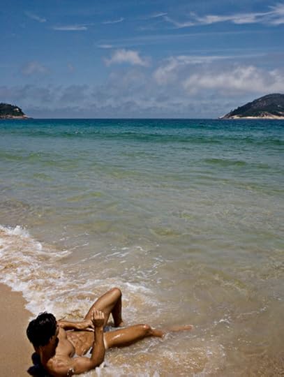 Photo Description: It's a bright, clear day; the perfect day for the beach. A dark-haired man lies on the sand, the tide washing over him. He is naked, well-tanned, and in very good shape. He is lying on his back, but is partially sitting up to stare at something off in the distance.