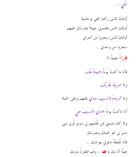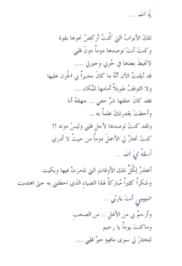 • لا تشغَل قَلبي بغيرِ حُبّكَ ولا تشغَل لسَانِي بغيرِ ذكِركَ ولا تشغَل جوارحِي بغيرِ الشوقَ إليكَ • في الحياةِ ضيقٌ لا ينفرجُ إلا معك ووحشةٌ لا يؤنسها سوى ذكرك في القلوبِ عتمةٌ لا تُضاءُ إلا بك وحزنٌ لا يبتسمُ إلا قُربك • ربي سامحني حينَ أحزن على شيء أردتهُ بقوة .. ولم تكتبهُ أنتَ لي .. فأنتَ الكريم .. وكُلَّ ما يأتي منكَ هو الخير كُلّه • أريدُّ قلباً يَا الله أنتَ كُلُّ ما فيه • فارغٌ هو أي قلبٍ امتلئ بسواك • الفقراءَ الذين يحملونَ ذكركَ دوماً في قلوبهم المطمئنةِ بكَ والذين يُشعلونَ بالصلاةِ لياليهم المُعتمةَ / الجائعه هم أكثرُّ غناً ممن تفيضُ جيوبهم بأموالِ الدُّنيا وقلوبهم فقيرةُ الذكر والبصيره !!ولا يكادون يعرفونكَ سوى بآياتٍ يعلقونها رياءً على جُدرانِ منازلهم المُتخمةِ ك بطونهم !!