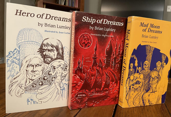 As a lost 20-something I came across Brian Lumley's books and they became a special part of my life. It was his horror novels first, but then Hero of Dreams showed up in the used bookshop I was getting them from, and this led me into Lumley's Cthulhu Mythos tales. I have since collected the limited editions from Paul Ganley, publisher (now defunct). Here's a trio of these lovingly-crafted tomes:
