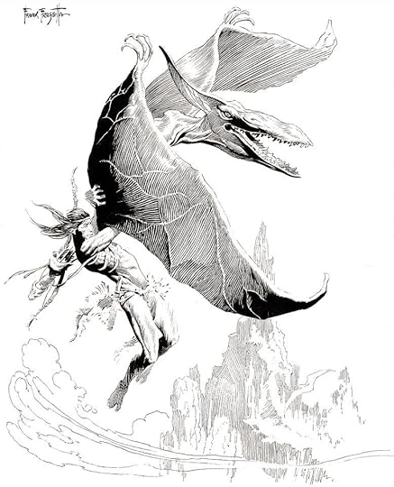 The only parts I remembered of this book from the age of 9 was the battle with the cave bear which was the cover painting by Frank Frazetta ~ and the gilding Stegosaurus that attacks Jason Gridley.
