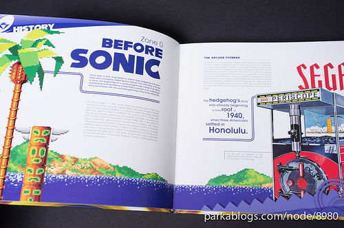 I really enjoyed this book. It is a 300 page celebration of Sonic's 20th birthday. Each chapter shows graphics from different games and discusses how the games developed. It is packed with many antidotes and stories about how the games came to fruition and some that did not.