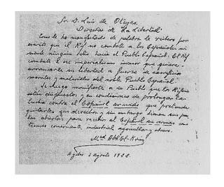 image: رسالة عبد الكريم Sr. D. Luis de Oteyza. Director de “La Libertad” Como le he manifestado de palabra le reitero por escrito que el Rif no combate a los Españoles ni siente ningún odio hacia el Pueblo Español. El Rif combate a ese imperialismo invasor que quiere arrancarle su libertad a fuerza de sacrificios morales y materiales del noble Pueblo Español. Le ruego manifieste a su Pueblo que los rifeños están dispuestos y en condiciones de prolongar la lucha contra el español armado que pretenda quitarles sus derechos, y sin embargo tienen sus puertas abiertas para recibir al español sin armas como técnico, comerciante, industrial, agricultor y obrero. Mad. Abd-el-Krim Aydir, 3 agosto 1922