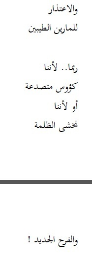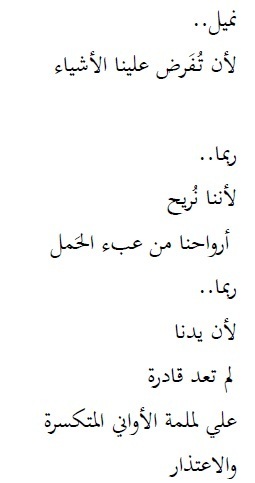 لا أحبذ قراءة الأقلام التي تكون مُشبعة بكاتب / شاعر ما ، كأني أقرأ نسخة مشوهة منه أو متكررة بشكل مفرط تعيس . بدءً بالعنوان الذي يُشبه إلى حد ما عنوان كتابٍ دارج و انتهاءً بالفكرة و المعنى و التنسيق ، كل شيء يُصبح مصطنعا إن فقد صاحب النص لمسته الخاصة . يتكرر خطأ فادح " على / علي " بشكل يُثير التعب في النفس .