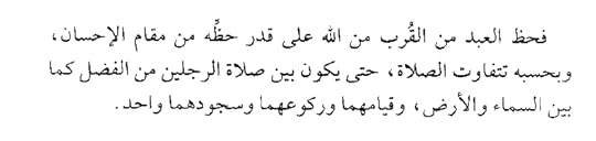 " فالمُحب راحته وقُرة عينه في الصلاة، والغافل المُعرض ليس له نصيب من ذلك، بل الصلاة كبيرة شاقة عليه، إذا قام فيها كأنه على الجمر حتى يتخلص منها، وأحب الصلاة إليه أسرعها، فإنه ليس له قرة عين فيها، ولا لقلبه راحة بها. والعبد إذا قَرّت عينه شئ استراح قلبه به فأشق ما عليه مُفارقته، والمُتكلف الفارغ القلب من الله والدار الآخرة المُبتلي بحب الدنيا أشق ما عليه الصلاة. ومما ينبغي أن يُعلَم أن الصلاة التي يُقَر بها العين ويستريح بها القلب هي التي تجمع بين ستة مشاهد : 1.الإخلاص، 2. الصدق والنصح، 3. المتابعة والإقتداء (بالرسول صلى الله عليه وسلم)، 4. الإحسان، 5. المِنَّة ( من الله سبحانه وتعالى)، 6.التقصير ( للإجتهاد وبذل وسعه).