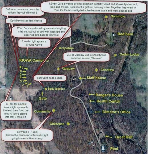 Timeline:- 4.30pm - all kids already moved in + settled in their cots (cloudy sky) 4.30pm - Carla took Hoppers girls to cafe for food preparation ---------------------------------------------------------------------------- ***few mins later*** other girls came for evening meal (started to rain) ## Meal time set - 6-7pm ## but extended to 7.30pm (rain/first day flexi) ++ Everyone at Great Hall for sing song, Everyone return to their camp units ---------------------------------------------------------------------------- 8pm - After dinner/ after heavy rain - kids return to their respective camps 8pm - All counselors have campers meeting at kitchen area (middle of the camp) ---------------------------------------------------------------------------- ++ Unit rep selected for each for duties delegations but any activity that day was cancelled because of the rain ++ Girls to write letter to their parents ++ Carla left meeting (her free time) to go Arapaho site to visit friend ++ homesick Denise asked Dee if she can call her mom, advice her to sleep on it ---------------------------------------------------------------------------- ++ A counselor spotted a dim light beyond tree line, suspect trying to be discreet and started to move towards the Kiowa Unit ++ the suspect seem to be aware that someone spotted his light and tried to hide his light beam ++ the creeped out counselor ran back to her friends .....did she report ? not mentioned in book ---------------------------------------------------------------------------- 10pm++ - Dee checked on Kiowa tents and talked to each of the kids, Tent 8 was last visit ---------------------------------------------------------------------------- ***few mins later*** Dee return to her own tent, closed the tent flap No.8 before she left ++ kids changed into their night clothes and went to sleep on their respective sleeping bags ---------------------------------------------------------------------------- 11pm++ - Susan return to counselor tent, pitch dark and no lights/fires near Kiowa Units ---------------------------------------------------------------------------- ++ Susan & Dee went to sleep -respective cots (front end) ***few mins later*** Carla came back on the way she heard some girls talking/laughing in their tents - Carla went to each noisy tents and ask them to go back sleep ++ Carla checked Tent 6, and stood near Tent 7 but no noise from 7 & 8 -return back to sleep ++ set alarm at 6am ---------------------------------------------------------------------------- *** 1hr++*** Carla woke up-sound from latrine from girls in Tent 2 making noise ++ Took her flash light and brough the girls back to their tent - went back to sleep ---------------------------------------------------------------------------- Quapaw Unit neighbors to Kiowa Unit - heard girls screaming ++ Counselors went to investigate ++ A girl said she was walking to the latrine when someone grabbed her by the raincoat ++ Other girls said someone was stalking around their tents ++ Another girl walking back to tent, saw a man's legs (khaki) when she dropped her towel ++ Counselors investigated and checked all around - found nothing, sent girls back to sleep!!!! ---------------------------------------------------------------------------- 1.30am - Carla woke again, girls giggling in Tent 5, scolded them to go back to sleep ++ Dee also woke up and both of them heard the low guttural moan ++ Both of them woke up and went to Tent 5 and listened around ++ Carla asked Dee to check out the moaning sound, Carla to check Tent 5 but decided to checkout the noise & Tent 5, herself ++ Followed the moaning towards the road leading to camp, when reach road - pointed flashlight in the direction of the sound - moaning stop ++ Turn to walk back - moaning started again, went back to the road - moaning stopped ++ Carla decided to return to the camp, went with Dee to check Tent 5 and return to their own unit. Moaning started again and continued ---------------------------------------------------------------------------- 2am++ - Dim/dull glow light appeared around Kiowa Camp, appear and disappear and reappear other end of units - very silent ++ Counselors flap we unhooked, Dee & Susan purse taken, Dee's glasses taken ++ Light re-appear around Tent 7, a 10 yo, saw the light through the mended panel, the other 3 girls hide their heads when panel jerked open and flooded with light, saw a dark figure glared into the tent before dropped the panel back down ++ figure moved to Tent 8, light disappeared when figure moved towards the back of the Unit 8 and slowly+quietly unhooked the back tent ---------------------------------------------------------------------------- ++ Arapaho, Kiowa, Quapaw, Cherokee Camps heard the low moaning throughout the night ++ Quapaw unit a girl heard someone screaming "Momma, Momma", she thought it was Lori who was know to be frighted before at Camp ---------------------------------------------------------------------------- 6am - Carla woke up (alarm), 30 mins before rest of the camp to get head start ready ++ approached intersection of trail and road, saw a bright yellow - walked over to investigate, saw 1 sleeping bag child (lump) lying down, saw another sleeping bag (lump) and walked towards the debris - saw another dead girl. ++ Run back to her camp - woke up Dee and Susan, urge to do a head count of all the girls ++ Carla and Susan started at Unit 2, Dee at Tent 8, they counted each girl by touching them ++ Dee reported back Tent 8 - empty, Carla insisted to keep counting incase the girls shared with other Units - only 24 counted instead of 27 girls ++ Carla return to Tent 8 - saw blood on floor + mattress ++ Carla asked Dee to keep their girls in their respective tents while she seek help from camp nurse, Maryanne ++ Susan discovered the bodies, screamed, touched the lump sleeping backs - no movements ++ Susan assigned to keep other girls in camp, Dee run to her car ++ Met Dee half way th