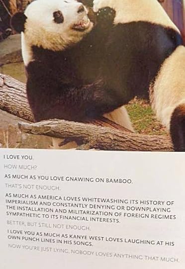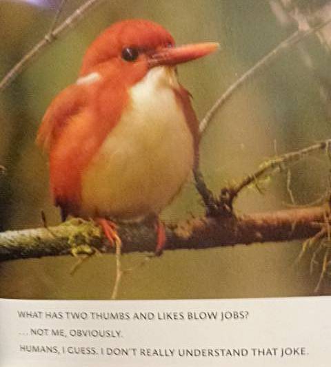 What began as something posted on social media became this book, with rather lovely photos of animals, birds, and other wildlife, accompanied by the author's hilarious, deadpan and spot-on inserted dialogue attributed to said creatures.