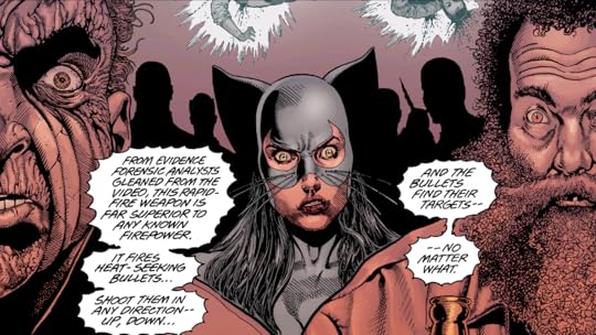 Es una historia rápida de leer donde Catwoman esta implicada en un crimen y atreves de esto se hace una reflexión sobre el tema de las armas (a favor o en contra) creo que es más bien una reflexión para aquellos que viven en países donde las armas sean legales (que no es mi caso por lo tanto para mi se queda un poco vacío con respecto a ese tema).