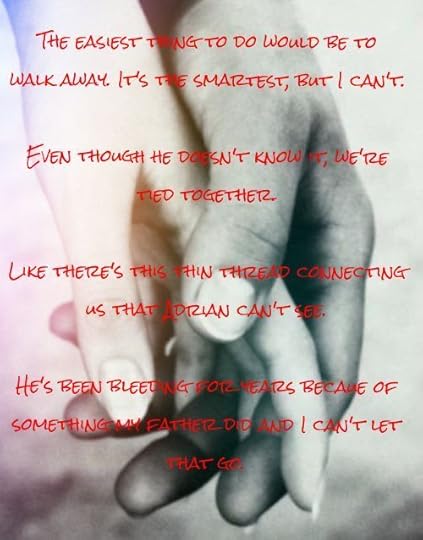 Even though he doesn’t know it, we’re tied together. Like there’s this thin thread connecting us that Adrian can’t see. He’s been bleeding for years because of something my father did and I can’t let that go.